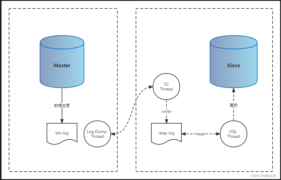 MySQL主从复制环境搭建 MySQL主从复制主要包含三个线程(Log Dump Thread、IO Thread、SQL Thread)和两个日志(Bin log、Relay log),Master的数据库变更会写到binlog中,binlog内容会通过Log Dump Thread线程发送给从节点,从节点的IO Thread线程读取到内容后会将内容写到Relay Log中,然后通过SQL Thread线程读取Relay Log并以SQL形式在Slave数据库执行。# master_connect_retry:重试时间。