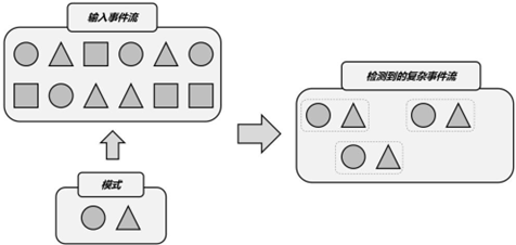 这个接口需要实现一个 processTimedOutMatch()方法,可以将超时的、已检测到的部分匹配事件放在一个 Map 中,作为方法的第一个参数;它们构成了一个新的“复杂事件流”,流中的数据就变成了一组一组的复杂事件,每个数据都包含了一个圆形和一个三角形。具体的处理过程是,把事件流中的一个个简单事件,通过一定的规则匹配组合起来,这就是“复杂事件”;在循环模式中,对同样特征的事件可以匹配多次。比如我们定义个体模式为“匹配形状为三角形的事件”,再让它循环多次,就变成了“匹配连续多个三角形的事件”。