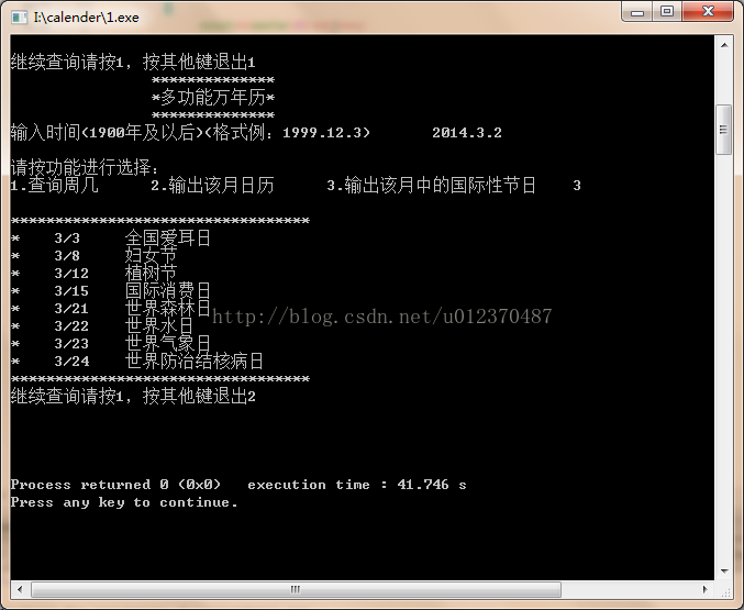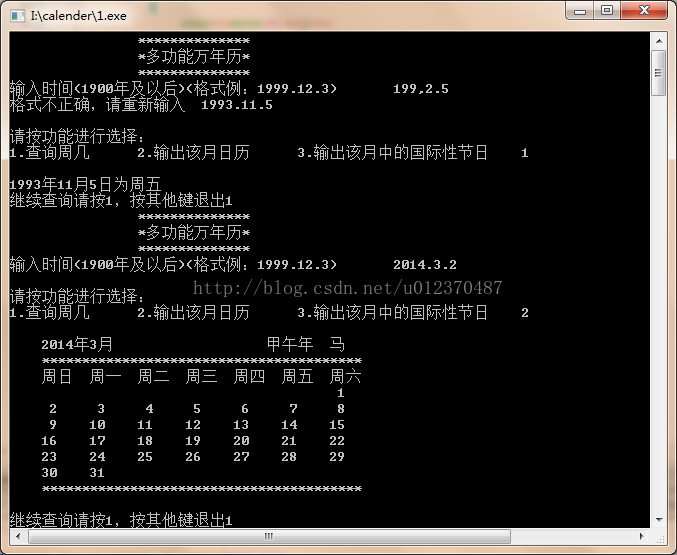cout<<"1.查询周几 2.输出该月日历 3.输出该月中的国际性节日\t";