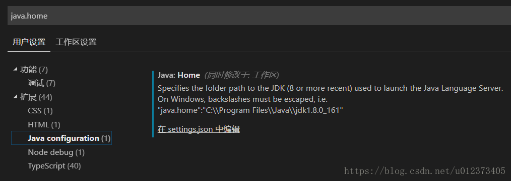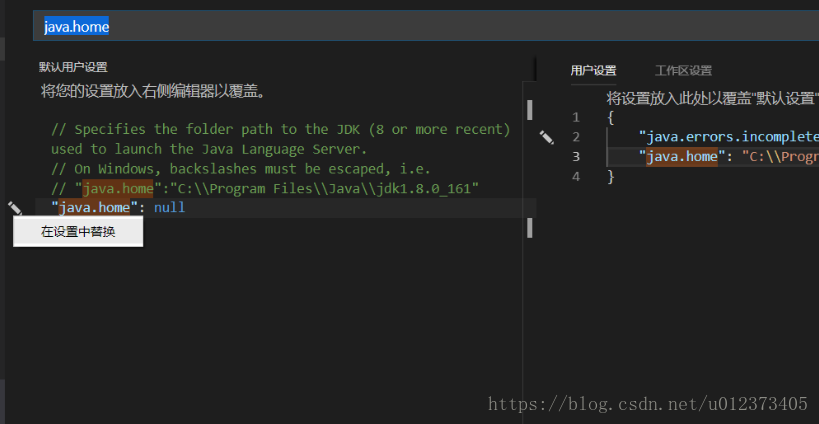 6. 点击如下界面左侧的铅笔icon,在设置中替换,右侧窗口的用户配置会增加一条java.home配置,属性值设为JAVA SDK的绝对路径"C:\\Program Files\\Java\\jdk1.8.0_121"。用同样的方法更改工作区设置,这些设置会覆盖默认设置。