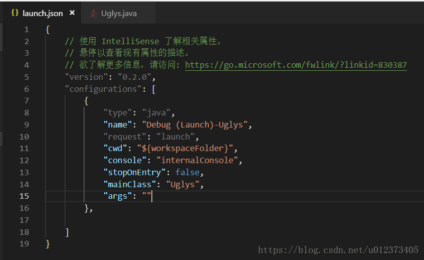 3. 生成的配置文件有3项配置,我把没有用的配置删掉,编辑mainClass属性指定主类,剩下的内容如上图所示。如果主类在更深的文件夹中,它也可以指定为"com.abc.def.class"的形式。