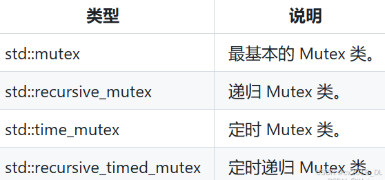 mutex头文件主要声明了与互斥量(mutex)相关的类。mutex提供了4种互斥类型,如下表所示。