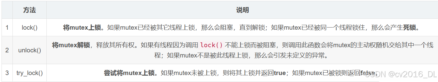 std::mutex是 C++11 中最基本的互斥量,一个线程将mutex锁住时,其它的线程就不能操作mutex,直到这个线程将mutex解锁。