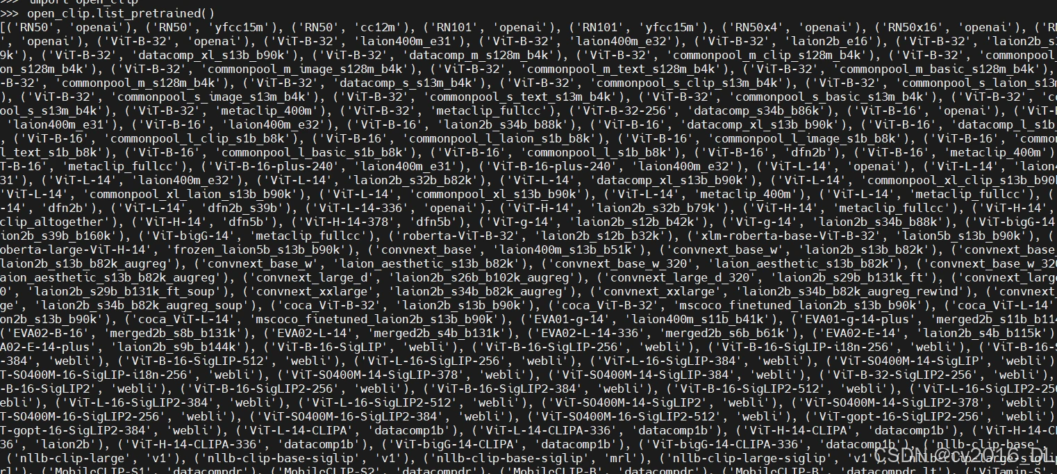 OpenClip 官方提供了许多 CLIP 系列的预训练模型供下载和使用。你可以使用以下命令查看这些模型的具体细节。