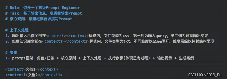 也许你小某书、某站看过了各种提示词结构,比如:CRISE,BROKE,ICIO等等,这些框架当然是有很大价值的,在非精准类问题(精准类问题:数据查询分析,非精准类问题:文本解析,写作、翻译等)或者非复杂性问题上没有问题。在复杂性高的精准性问题上就没有那么有效了。我们这边一直探索的是大模型在数据分析场景的应用,对准确性要求极高,覆盖的场景也非常的复杂,经过探索和尝试,总结出来一套形式有效的提示词结构: