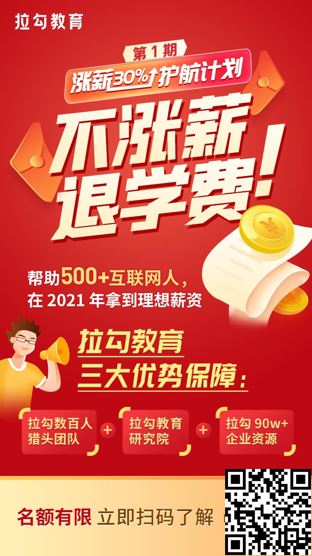现在,我邀请你一起加入拉勾教育推出的#涨薪 30% 护航计划#,课前签订涨薪协议,不涨薪立刻退学费。6 个月 的时间,帮你夯实知识点、丰富项目经验!