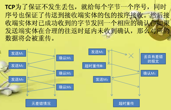 在TCP的连接中,数据流必须以正确的顺序送达对方。TCP的可靠性是通过顺序编号和确认(ACK)来实现的。TCP在开始传送一个段时,为准备重传而首先将该段插入到发送队列之中,同时启动时钟。其后,如果收到了接受端对该段的ACK信息,就将该段从队列中删去。如果在时钟规定的时间内,ACK未返回,那么就从发送队列中再次送出这个段。TCP在协议中就对数据可靠传输做了保障,握手与断开都需要通讯双方确认,数据传输也需要双方确认成功,在协议中还规定了:分包、重组、重传等规则;而UDP主要是面向不可靠连接的,不能保证数据正确到达目的地。