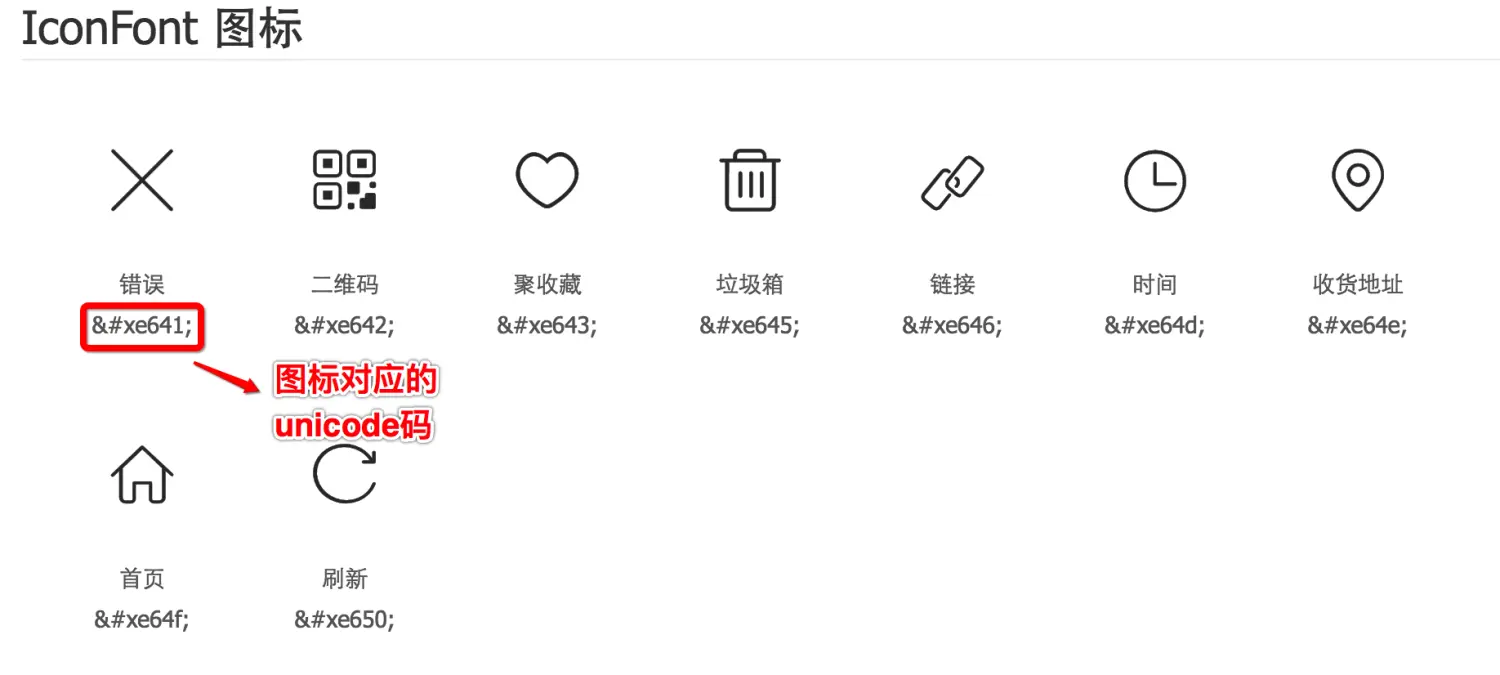要显示iconfont中图片, 需要把text设置为图片对应的unicode码.