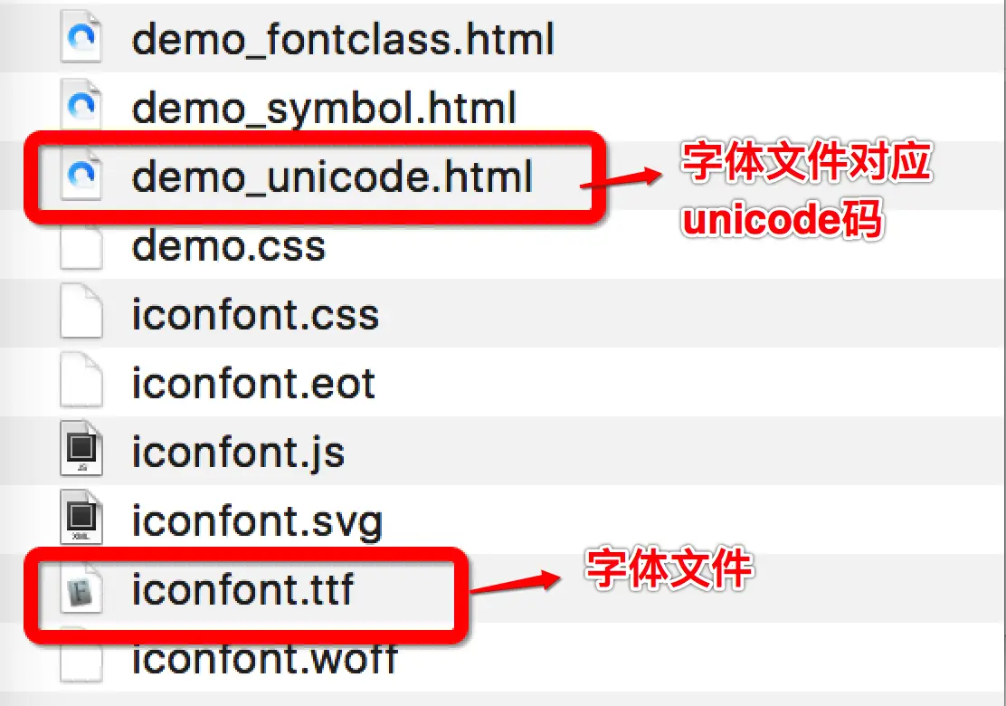 3.下载的文件中可以看到字体文件(iconfont.ttf) 和对应的编码表