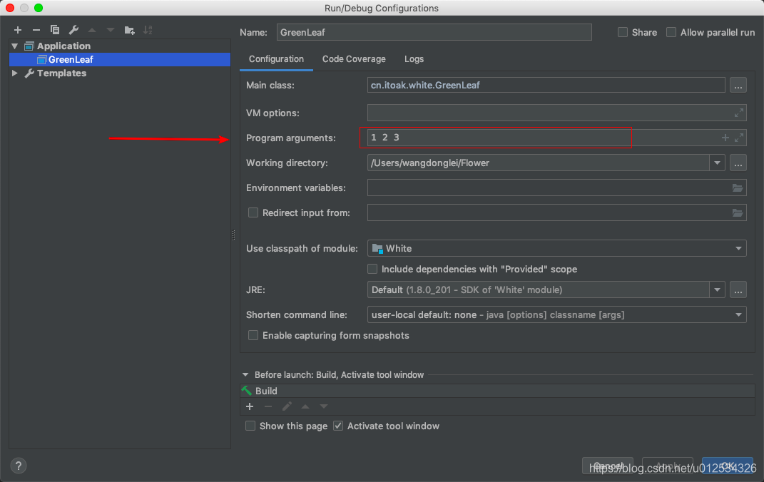 2.然后,在主类的Configuration -> Program arguments中输入你的参数,多个参数以空格分隔: