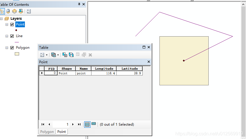 将创建的点、线、面导入到ArcGIS中显示如下: