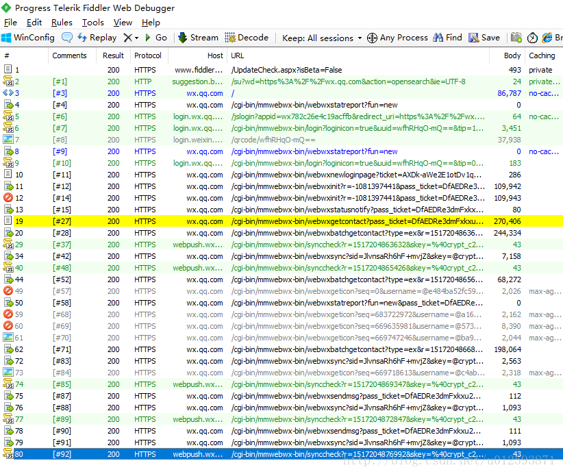 这个微信版网页版虽然繁琐,但是不是很难,全程不带加密的。有兴趣的可以试着玩一玩, 如果有兴趣的话,可以完善一下,做一些比较有意思的东西。 开发环境:Windows10 开发语言:Python3.6 开发工具:pycharm 抓包工具:fiddler 抓的包如下:import requests import time import re from bs4 import BeautifulSoup import json import random from copyheaders import headers_raw_to_dict DEFAULT_HEADERS={ b'Host': b'wx.qq.com', b'Connection': b'keep-alive', b'Cache-Control': b'max-age=0', b'User-Agent': b'Mozilla/5.0 (Windows NT 10.0; WOW64) AppleWebKit/537.36 (KHTML, like Gecko) Chrome/63.0.3239.84 Safari/537.36', b'Upgrade-Insecure-Requests': b'1', b'Accept': b'text/html,application/xhtml+xml,application/xml;q=0.9,image/webp,image/apng,*/*;q=0.8', b'Accept-Language': b'zh-CN,zh;q=0.9', } def get_13_time(): return str(int(time.time()*1000)) class WXRobot(object): def __init__(self): self.s = requests.session() self.s.verify = False self.s.headers = DEFAULT_HEADERS self.DeviceID='e'+str(random.random())[2:17] def visit_index(self): url = 'https://wx.qq.com/' self.s.get(url) def visit_jslogin(self): url='https://login.wx.qq.com/jslogin?appid=wx782c26e4c19acffb&redirect_uri=https%3A%2F%2Fwx.qq.com%2Fcgi-bin%2Fmmwebwx-bin%2Fwebwxnewloginpage&fun=new&lang=zh_CN&_={}'.format(get_13_time()) r=self.s.get(url) text=r.text maths=re.findall(