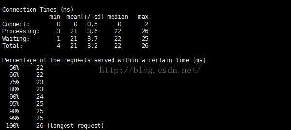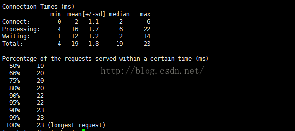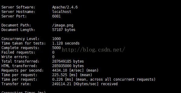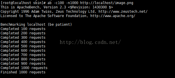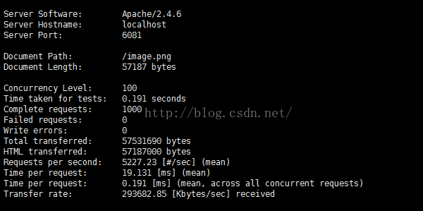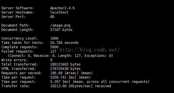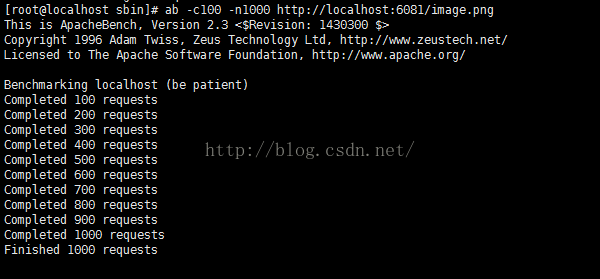 测试对一幅图片57817字节的图片进行1000次请求,并发量为100,性能数据如下: