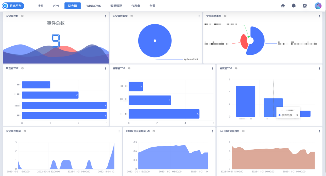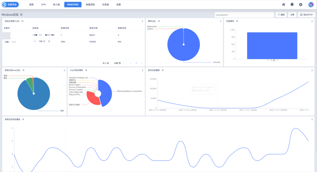 其次以可视化方式展示对VPN日志、Windows事件、防火墙事件、主机指标的分析效果。包括:VPN目的地址TOP10统计、VPN源地址TOP10统计、Windows登录分析、安全事件分类占比统计、攻击者排名、异常事件趋势等,以图形化方式展现数据中蕴含的信息,让用户从看数据转变为看图形。