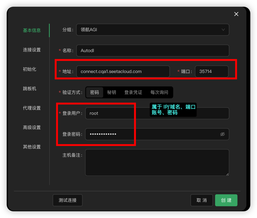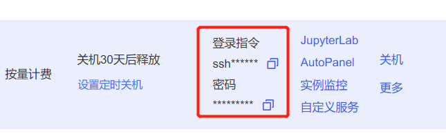以 AutoDL 云平台为例,下面介绍两种方式,一种为终端命令的方式(适合Linux/Mac用户),另一种为图形工具的方式(仅能用于Windows)