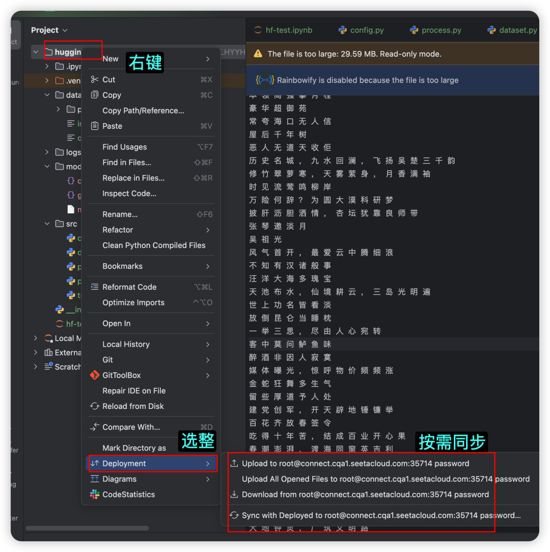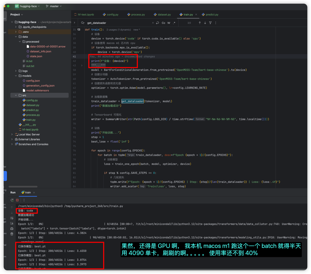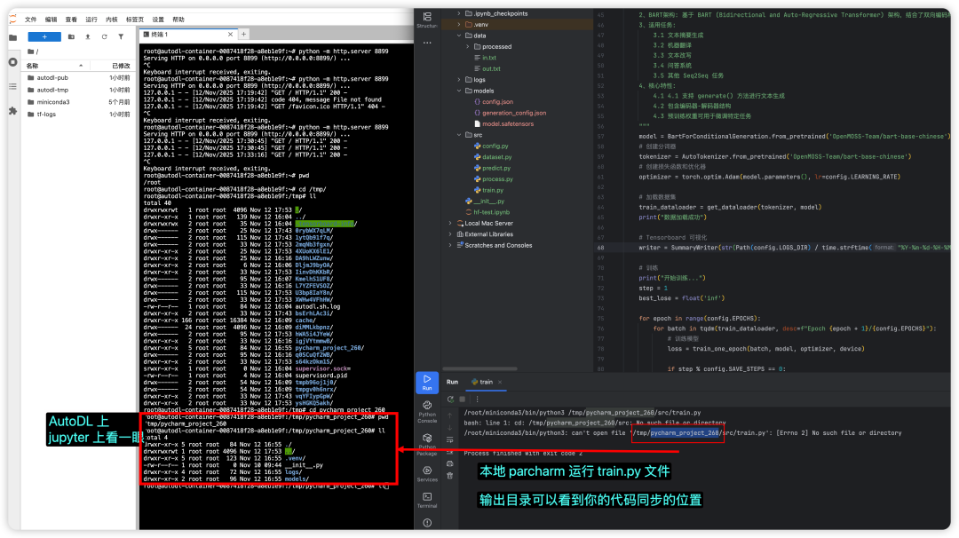 这回,你可以在本地尽情使用 Pycharm 调试你的项目了,而运行是在远端 AutoDL 的 GPU 实例上了。
