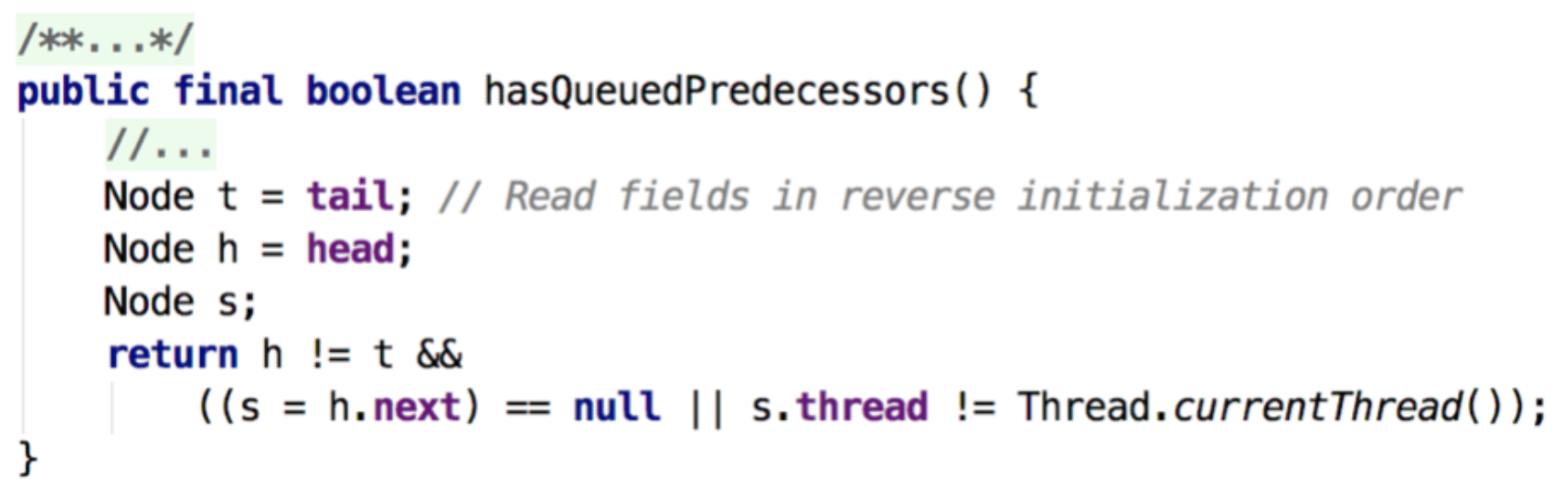 广叔:非常正确,再进入hasQueuedPredecessors(),可以看到该方法主要做一件事情:主要是判断当前线程是否位于同步队列中的第一个。如果是则返回true,否则返回false。