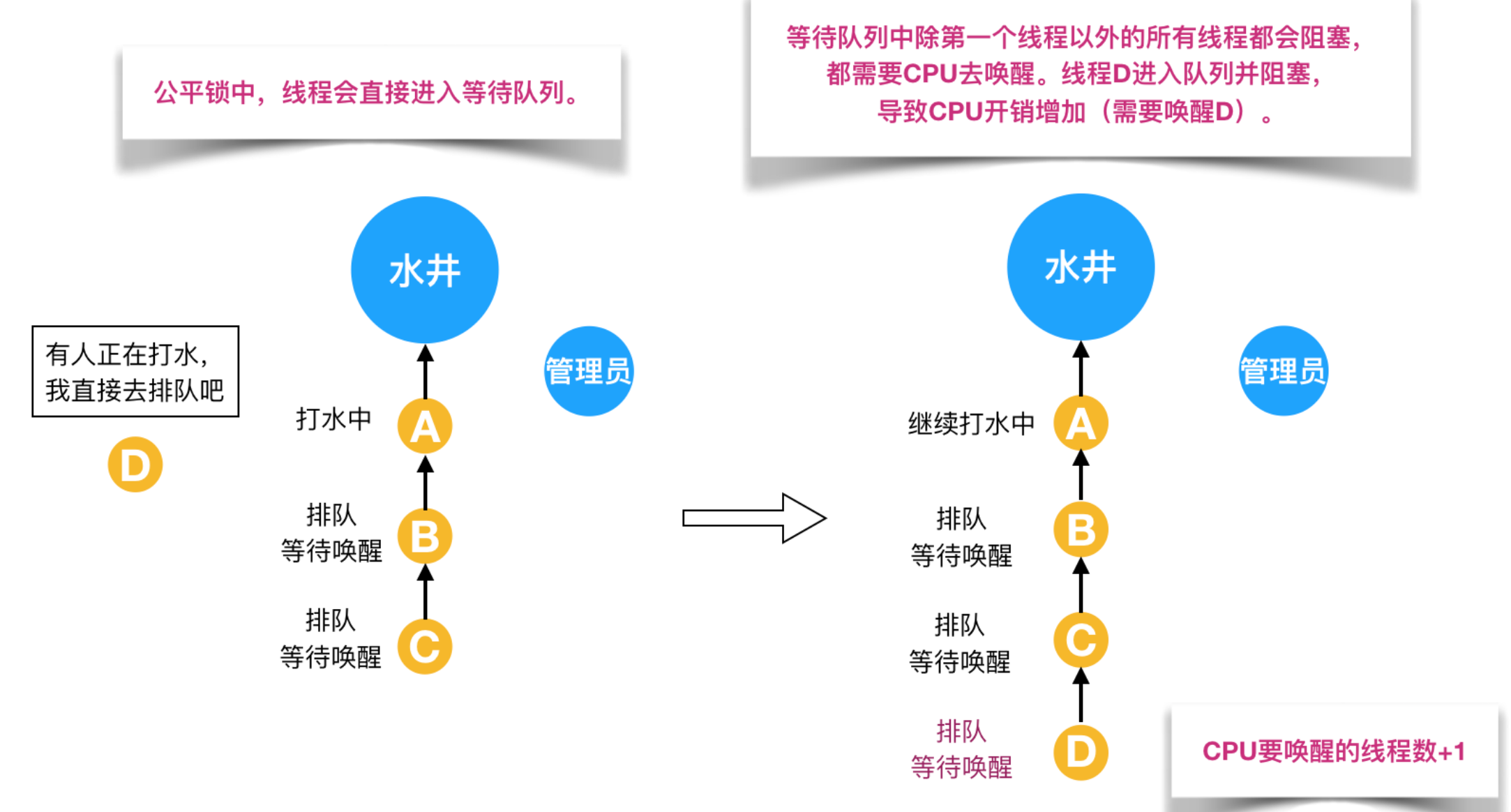 广叔:算了,给你举个例子吧,还是打水的例子,但是对于非公平锁,管理员对打水的人没有要求。即使等待队伍里有排队等待的人,但如果在上一个人刚打完水把锁还给管理员而且管理员还没有允许等待队伍里下一个人去打水时,刚好来了一个插队的人,这个插队的人是可以直接从管理员那里拿到锁去打水,不需要排队,原本排队等待的人只能继续等待。