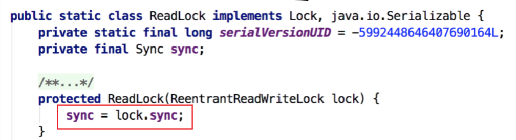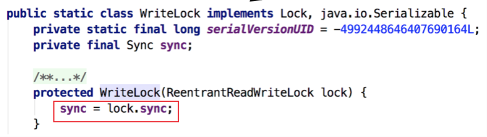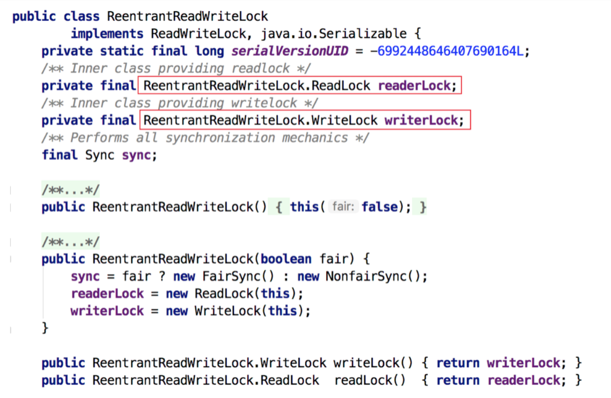 广叔:那我这次先通过ReentrantLock和ReentrantReadWriteLock的源码来介绍独占锁和共享锁。先看下ReentrantReadWriteLock的部分源码: