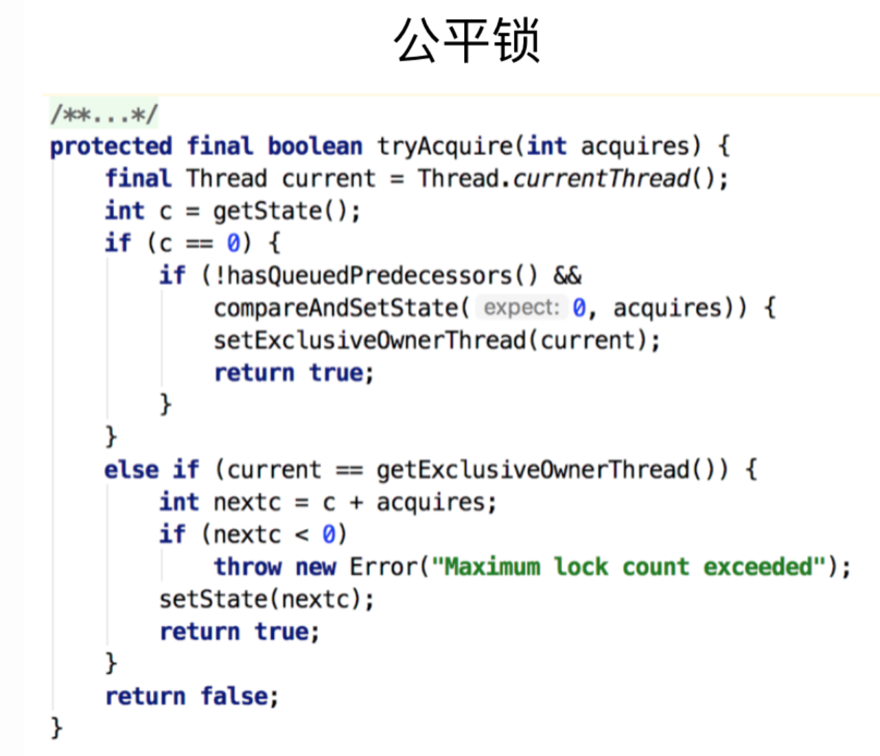 令狐冲:我只能看出公平锁与非公平锁的lock()方法唯一的区别就在于公平锁在获取同步状态时多了一个限制条件:hasQueuedPredecessors()。