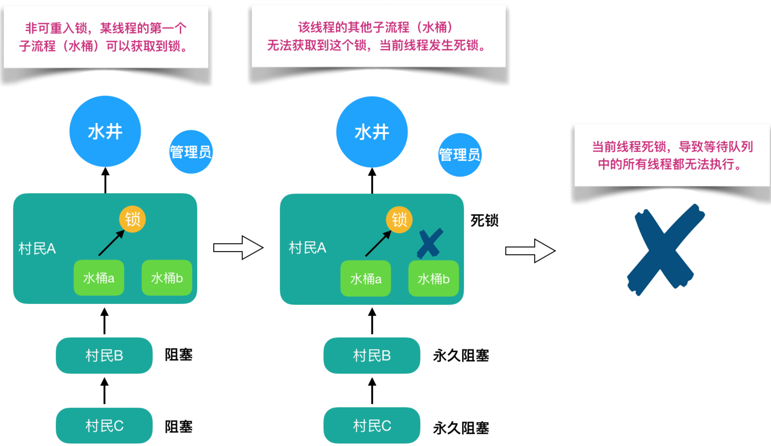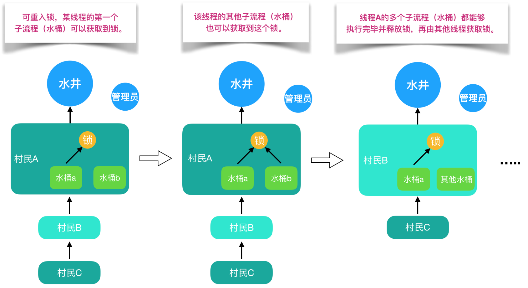 广叔:有多个人在排队打水,此时管理员允许锁和同一个人的多个水桶绑定。这个人用多个水桶打水时,第一个水桶和锁绑定并打完水之后,第二个水桶也可以直接和锁绑定并开始打水,所有的水桶都打完水之后打水人才会将锁还给管理员。这个人的所有打水流程都能够成功执行,后续等待的人也能够打到水。这就是可重入锁。