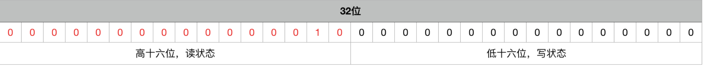 广叔:**在独占锁中这个值通常是0或者1(如果是重入锁的话state值就是重入的次数),在共享锁中state就是持有锁的数量。但是在ReentrantReadWriteLock中有读、写两把锁,所以需要在一个整型变量state上分别描述读锁和写锁的数量(或者也可以叫状态)。于是将state变量“按位切割”切分成了两个部分,高16位表示读锁状态(读锁个数),低16位表示写锁状态(写锁个数)。**如下图所示: