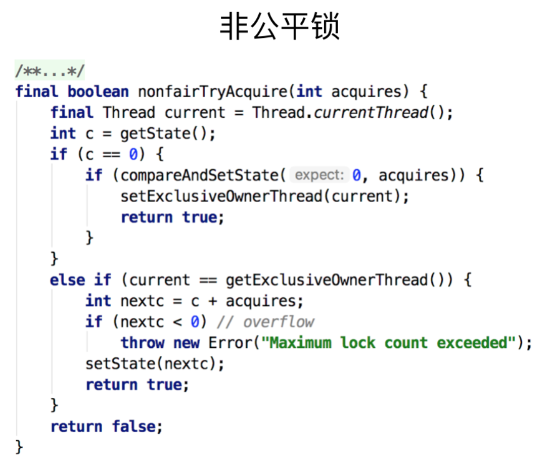 广叔:是的,最后给你看下互斥锁ReentrantLock中公平锁和非公平锁的加锁源码: