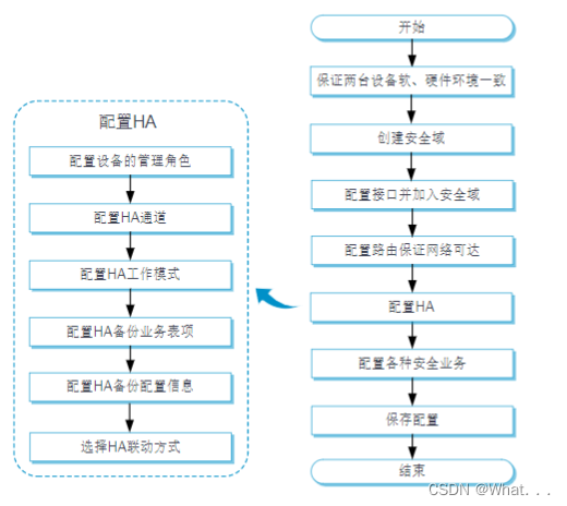- 对于HA支持配置信息同步的业务模块只需要在主管理设备上配置相关功能即可,对于不支持配置信息同步的模块需要在HA的所有设备上均配置相关功能