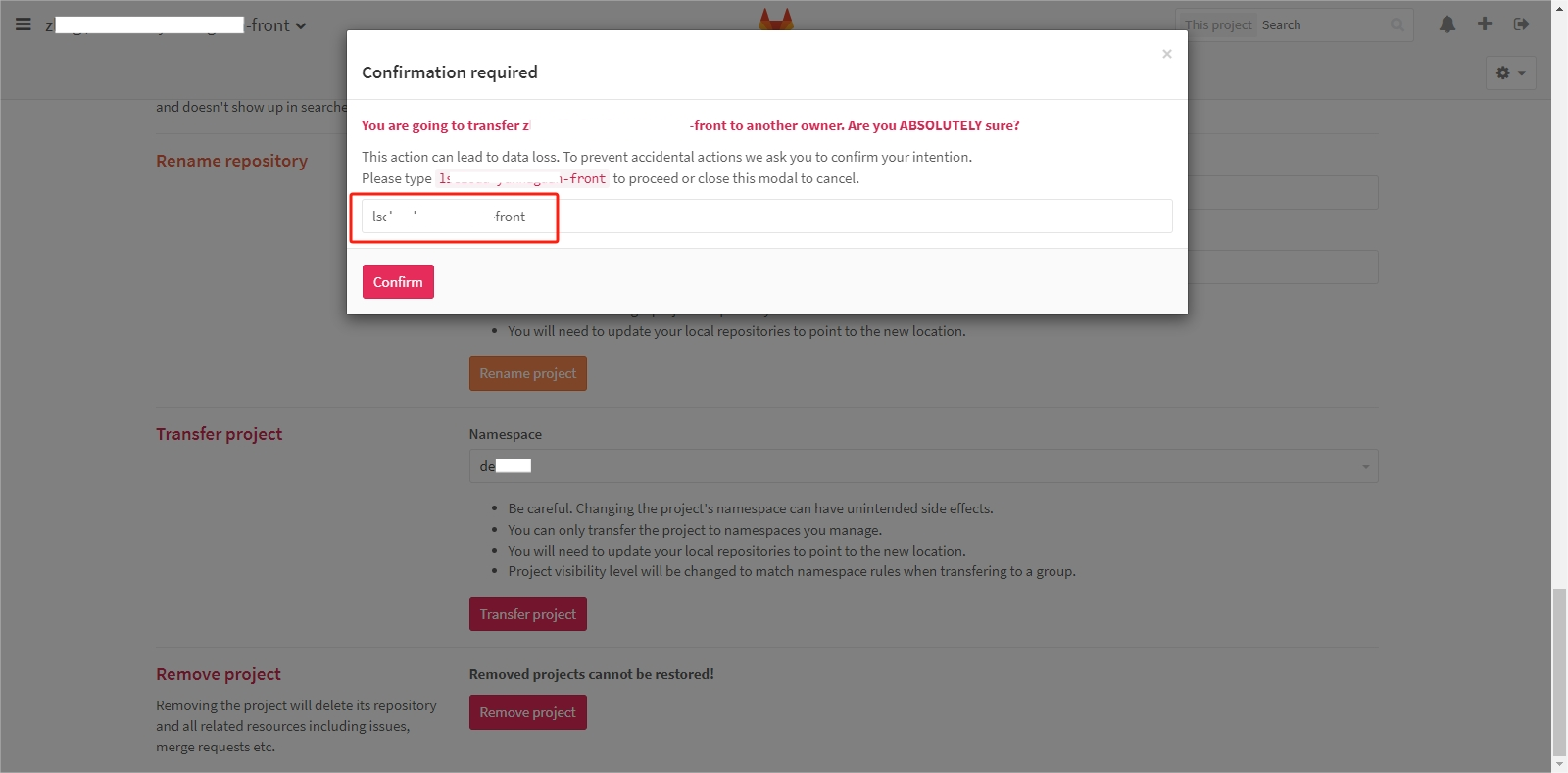 选择完Namespace会弹窗确认修改,这里输入仓库名称,然后点击Confirm确认就修改成功了