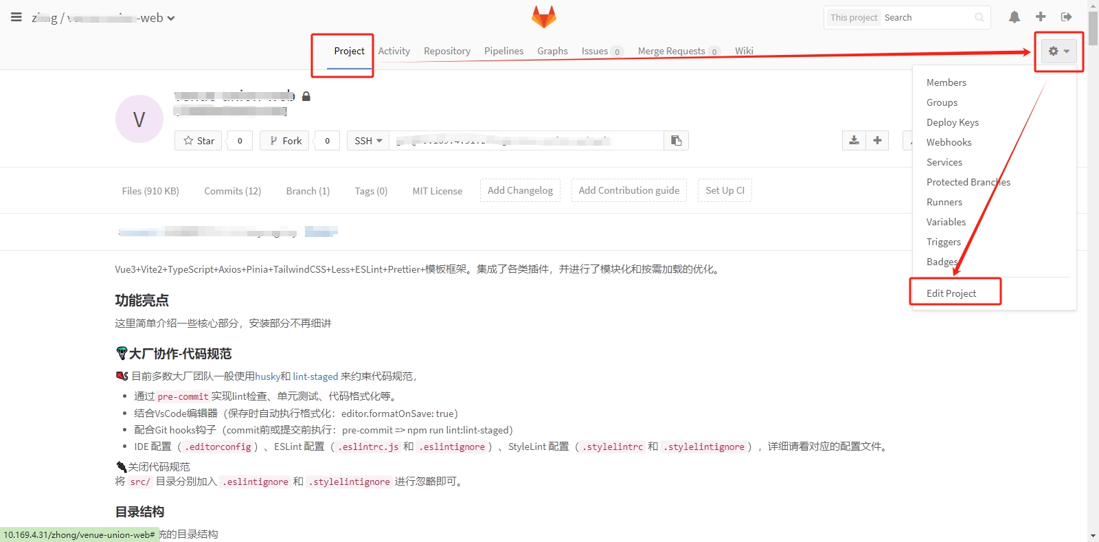 点击个人仓库,进入仓库首页,点击菜单【Project】=》点击右侧齿轮=》下拉点击【Edit Project】