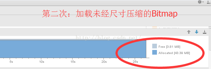 我分三次测试:第一次,什么都不加载的一个空项目;第二次,加载上面那张“高德地图的截图”;第三次,加载经过尺寸压缩(采样率为2)后的“高德地图截图”。然后对比这三次每次分配的内存总量,三次的测试结果如下: