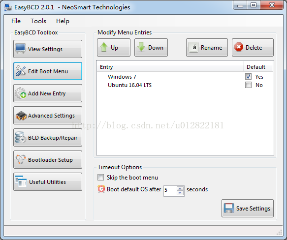 原因是我更新了Ubuntu系统之后导致之前在Windows 7 EasyBCD设置的Ubuntu 16.04的引导失效,此时应该怎么办呢?其实解决办法也很简单,只要在EasyBCD中重新添加Ubuntu 16.04的引导条目就可以了。如图1: