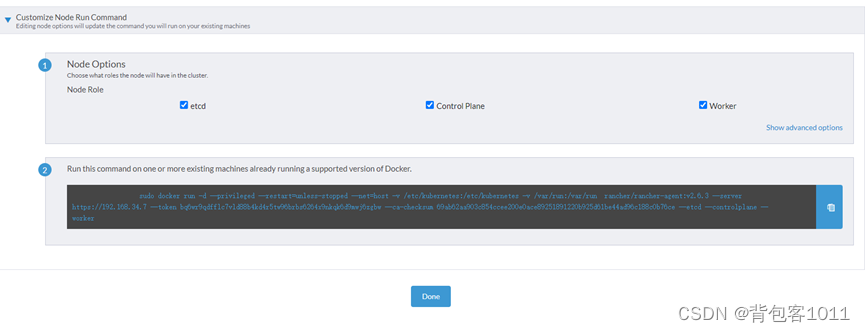 在master主节点运行,选中 etcd、 Control Plane、Worker, 复制下边代码到master节点执行, 在node节点执行,只需要选中 Worker 复制下边代码到node节点