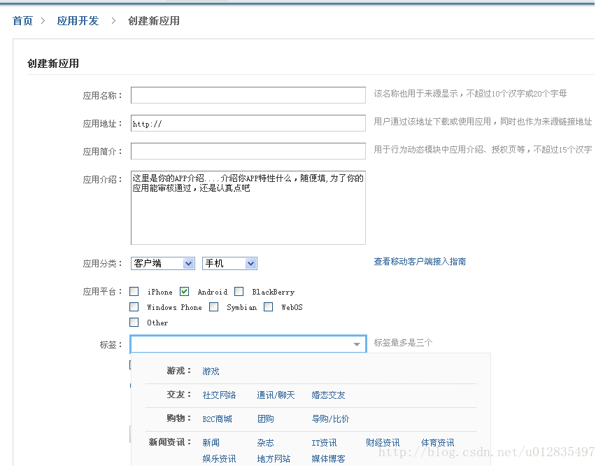 第四步,当我们点击了创建应用,你需要填写以下信息,如图:
