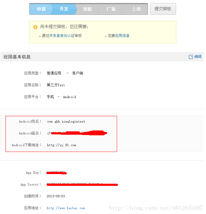 记住,以上画红线部分,千万不要泄露出去,因为会对公司造成安全隐患,特别是Android签名、App Secret,如果App Secret不小心泄露出去的话,你可以点击该条目,进入编辑页,进行重置,其中android签名是根据新浪提供的一个app_signatures.apk生成的一串MD5加密字符串,然后填上去,就哦了!下面是一个示例,还要记住的是,要想使用此工具生成一串MD5加密字符串,那你就必须将该应用安装到你的手机上,因为该MD5加密字符串是根据包名及xx.keystore生成的,Eclipse集成开发工具Run as 所使用的是debug.keystore 所以当你在发布你的APP的时候,一定要根据你自己公司的 .keystore 生成MD5加密字符串填到android签名哪一项上去,如果你填的是你通过Eclipse集成开发工具中的Run as 安装到手机上去的debug.keystore生成的MD5加密字符串的话,那么会导致无法授权登录问题产生。所以,一旦你要发布APP时,一定要更正回来,一般来说,一个公司keystore只有一份,根据报名产生的MD5加密字符串效果图如下: