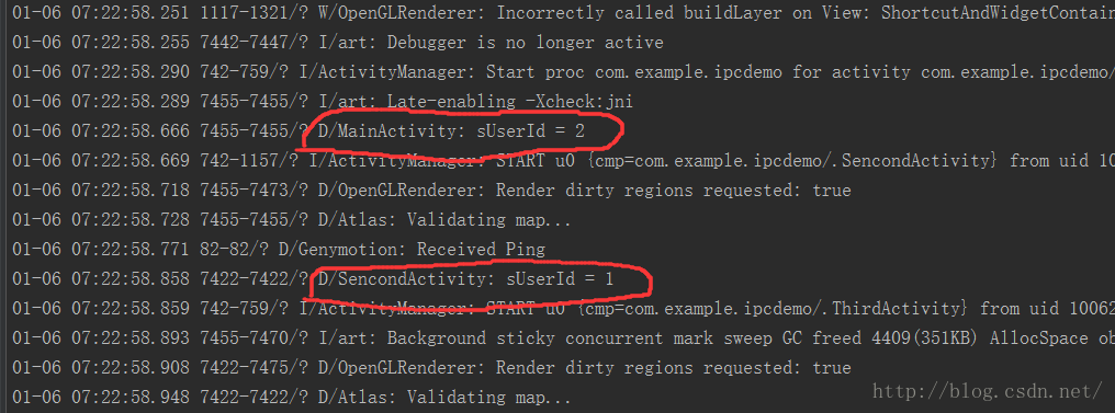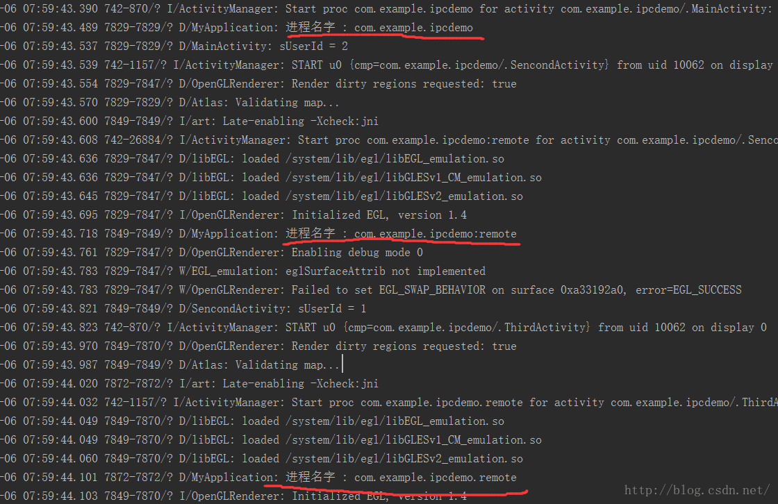 在上面的清单文件中,我们会发现,我们SencondActivity与ThirdActivity所声明的process方式是不一样的?一个是“ :remote”,一个是加上全部包名,“com.example.ipcdemo.remote”,那么他们之间有什么区别呢?当然是有区别的,对于,ThirdActivity中的声明方式,它是一个i额完整的声明方式,并且它不会附加包名信息,而SencondActivity则会附加包名信息。如果是以“:”开头的进程属于当前应用的私有进程,其他应用组件不可以和它跑到一个进程里,如果不是以“:”开头的进程属于全局的进程,其他的应用可以通过ShareUID可以和它跑到同一进程当中,我们知道Android系统会为每个应用分配一个唯一的UID,相同应用的UID的应用才能共享数据。但是这里要讲明的是,如果两个应用通过SharedUID跑到同一个进程中需要这两个应用的SharedUID相同并且签名也要相同才可以。当然,在这种情况下,他们可以互相访问对方的私有数据,比如:data目录,组件信息等,不管它们是否是跑在同一个进程当中,还有就是它们如果跑在同一个进程当中的话,除了能访问data目下、组件信息,还可以共享内存信息。