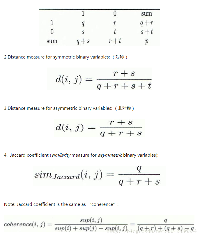 有时候二元变量有相同的权重,如“男”“女”,但有时候二元变量优先权不同,或者说权重不同,通常将重要的变量编码为1,,两个不对称的变量,如果编码值都为1更有意义,基于这样的相似度成为非对称相似度。这种相似度的评价最著名的就是jaccard系数。