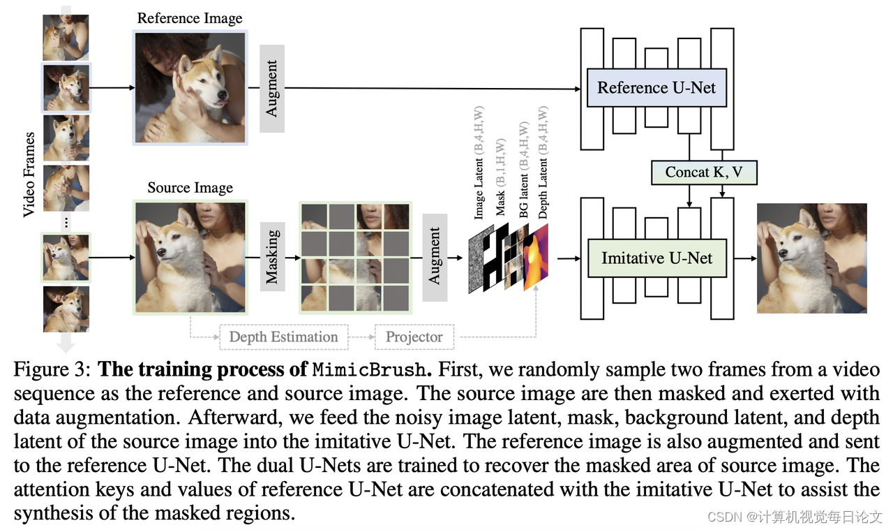 具体来说,用户可以直接从在线相关图片中汲取灵感,系统会自动弄清楚如何从参考图片中获取信息来进行编辑。为实现这一目标,我们提出了一种生成式训练框架——MimicBrush。它随机选择视频片段中的两个帧,遮盖其中一个帧的某些区域,并学习利用另一个帧的信息来恢复被遮盖的区域。