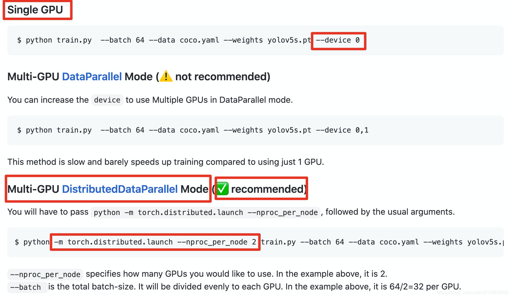 https://github.com/ultralytics/yolov5/issues/475,而不是主页上的,主页上的会仅仅使用CPU训练。当使用单机多卡时,一定要使用最新的