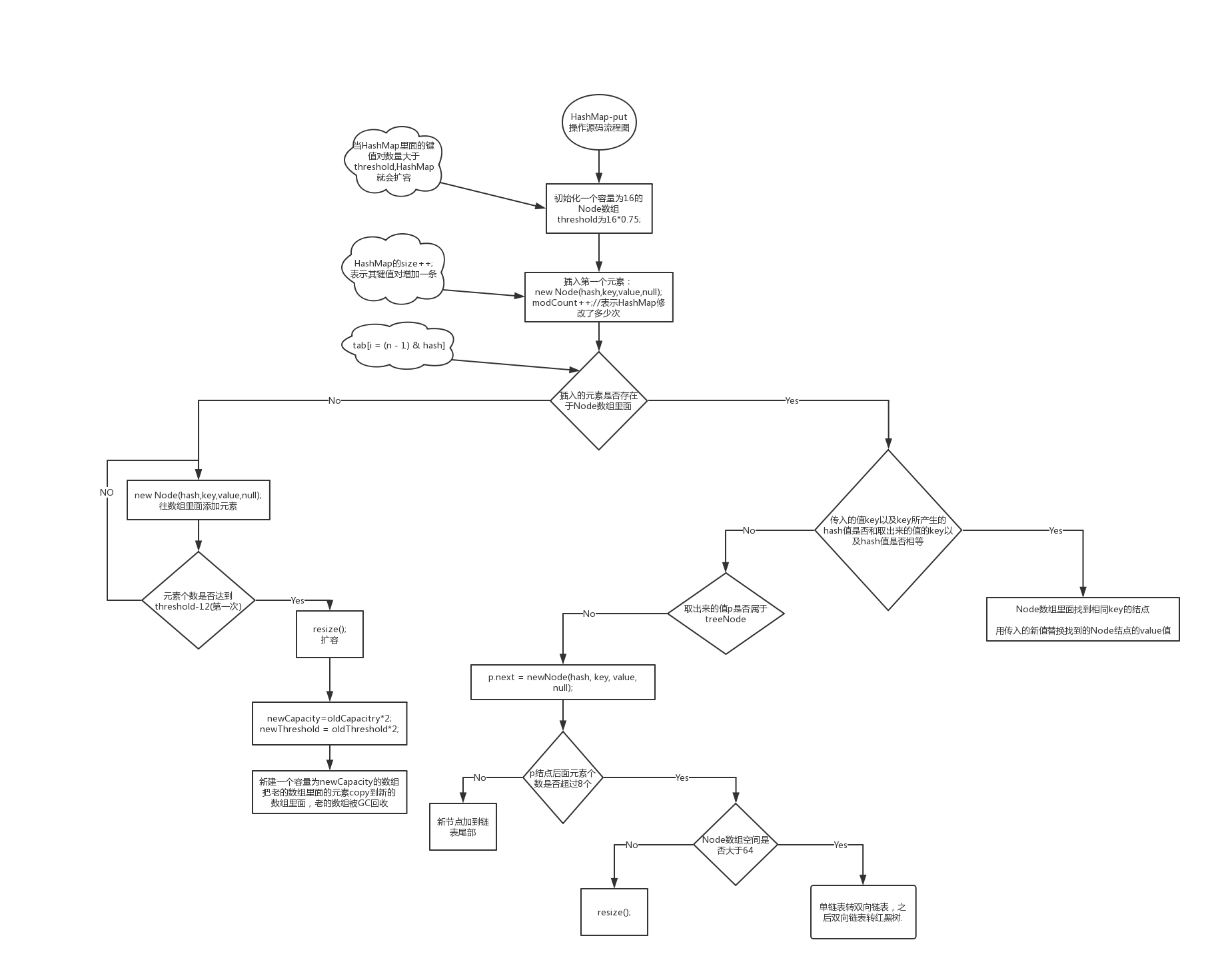 2.当put操作发生hash冲突的时候,会用拉链法解决冲突。但是如果在同一内存地址冲突的数据超过8个时,并且这个时候Node数组的容量大于 等于64,那么这个时候再在该位置添加元素会把单链表变成双向链表最后再转换成红黑树来进行存储数据。采用红黑树存储数据目的是在该冲突的地址查询数据的时候能够更快,提高查询效率。存储结构转换图: