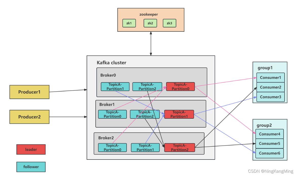 一个主题支持多个分区(数据的水平扩容),分区的容灾是基于Kraft(kafka2.8后不再依赖zookeeper,上图是未引入kraft协议的架构图)数据一致性协议的多副本机制,分Leader副本和Follwer副本