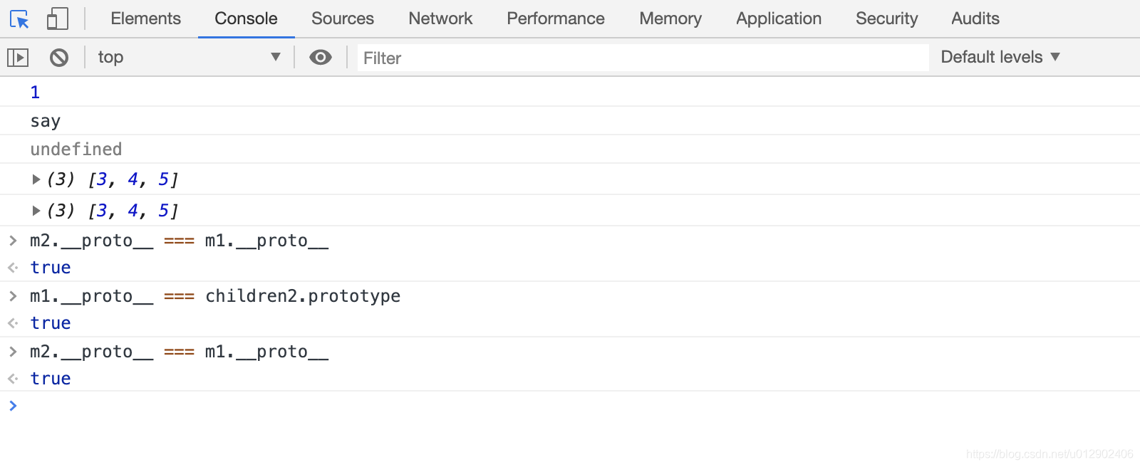 结果如图:这样的继承虽然全部继承了,可以找到name和say属性,但是由于m2.__proto__ === m1.__proto__ 为true,都指向同一个原型链children2.prototype,所以当m1数组改变的时候,m2也跟着变