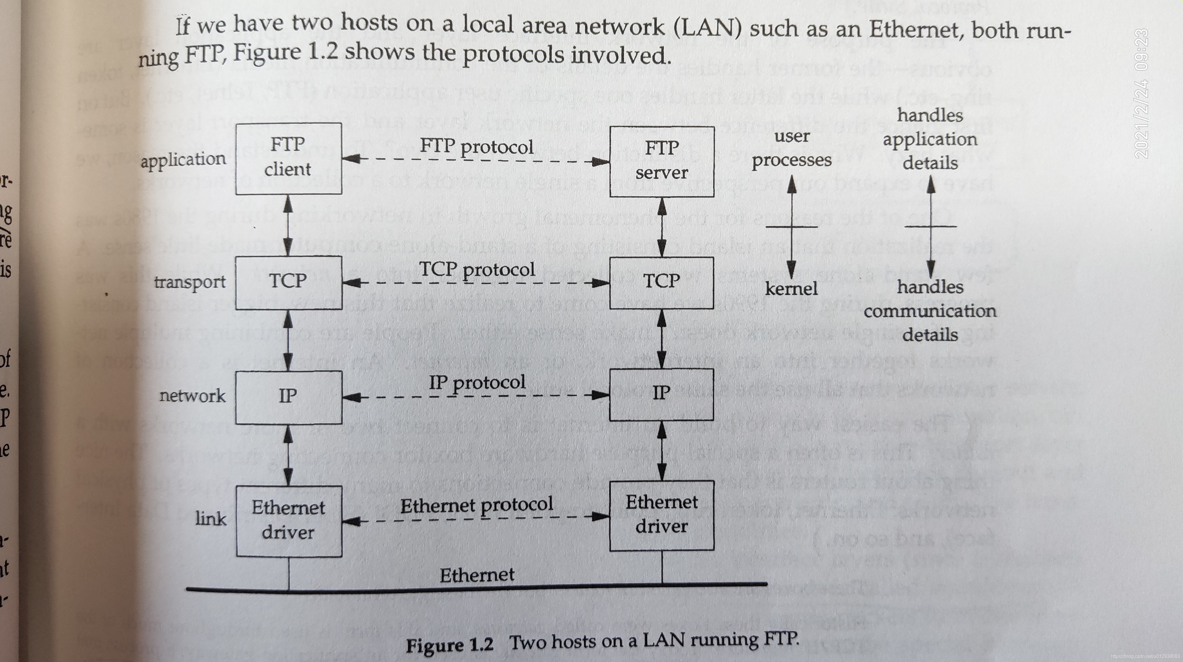 包括设备驱动及对应的网卡,它们一起处理通信介质细节(together they handle all the hardware details of physically interfaceing with the cable),比如 Ethernet, token ring 等