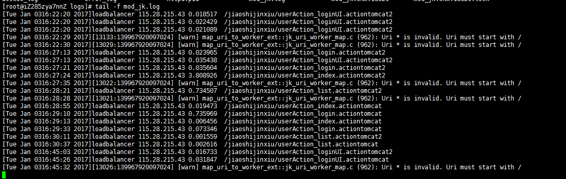 将自己的项目同时部署到两个tomcat的webapps下,启动apache,tomcat,然后访问项目,通过查找/usr/local/apache/logs/mod_jk.log的日志,可以看到: