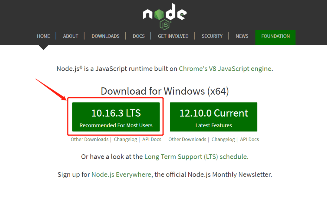 因为 Hexo 需要 nodejs 环境,因此需要先下载安装 Nodejs。点击 NodeJs 官网,下载最新版本。