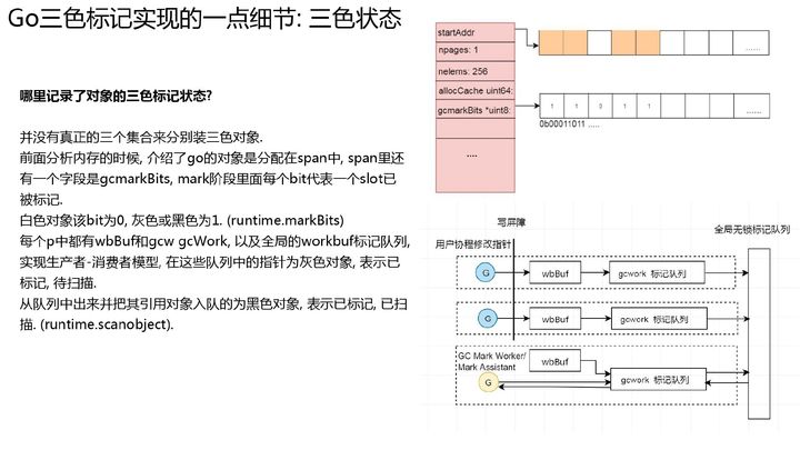 对于很小的对象分配, go 做了个优化, 把小对象合并, 以移动指针的方式分配.对于栈内存有 stackcache 分配, 也有多个层次的分配, 同时 stack 也有多个不同 size. 用于分配 stack 的内存也是位于 go gc heap, 用 mspan 管理, 不过这个 span 的状态和用于分配对象的 mspan 状态不太一样, 为 mSpanManual.