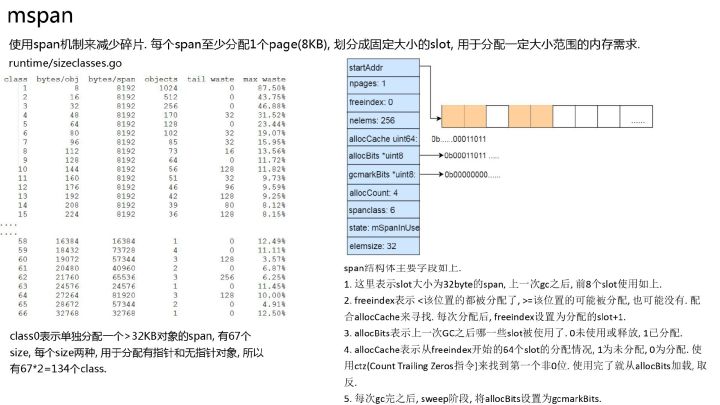 前面提到了 go 的内存分配类似于 tcmalloc, 采用了 span 机制来减少内存碎片. 每个 span 管理 8KB 整数倍的内存, 用于分配一定范围的内存需求.