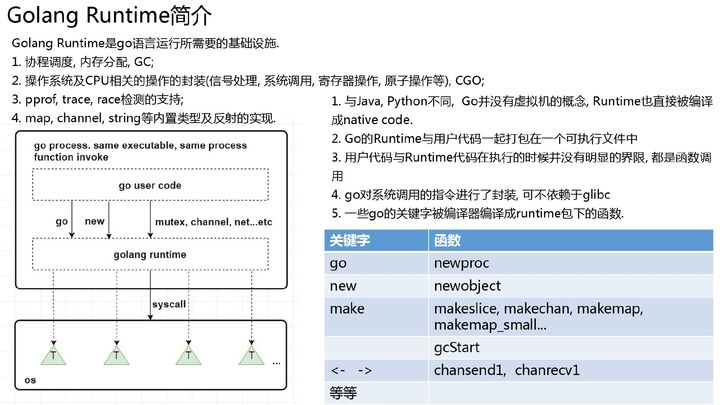 提到 runtime, 大家可能会想起 java, python 的 runtime. 不过 go 和这两者不太一样, java, python 的 runtime 是虚拟机, 而 go 的 runtime 和用户代码一起编译到一个可执行文件中.