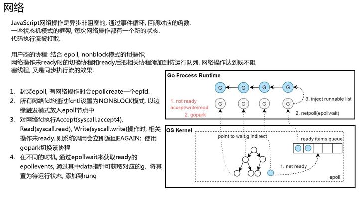 go 写后台最舒服的就是能够以同步写代码的方式操作网络, 但是网络操作不阻塞线程.主要是结合了非阻塞的 fd, epoll 以及协程的切换和恢复.linux 提供了网络 fd 的非阻塞模式, 对于没有 ready 的非阻塞 fd 执行网络操作时, linux 内核不阻塞线程, 会直接返回 EAGAIN, 这个时候将协程状态设置为 wait, 然后 m 去调度其他协程.