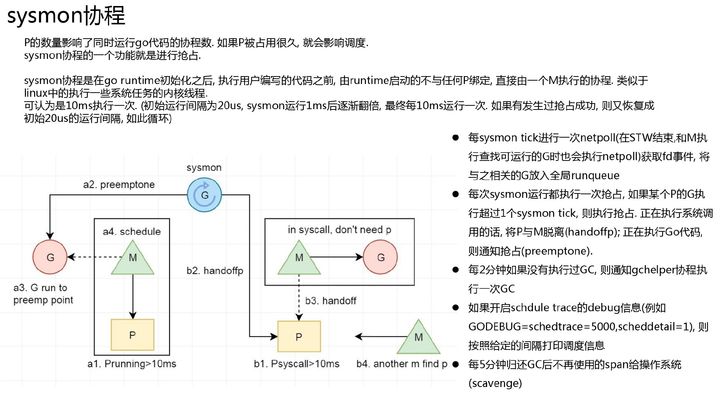 在 linux 内核中有一些执行定时任务的线程, 比如定时写回脏页的 pdflush, 定期回收内存的 kswapd0, 以及每个 cpu 上都有一个负责负载均衡的 migration 线程等.在 go 运行时中也有类似的协程, sysmon.功能比较多: 定时从 netpoll 中获取 ready 的协程, 进行抢占, 定时 GC,打印调度信息,归还内存等定时任务.